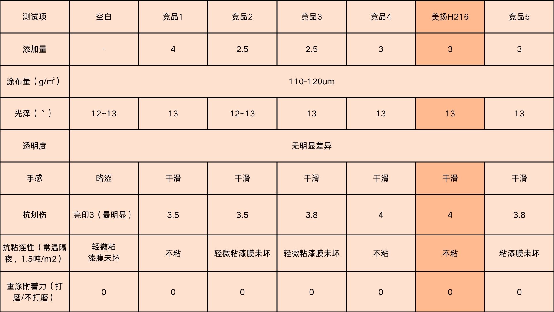 结果表明,WAX AQ H216在保持顶尖抗粘连性能的同时,在光泽、手感、抗划伤及重涂性等各方面均表现优异,是一款综合性能均衡的“全能型”选手。